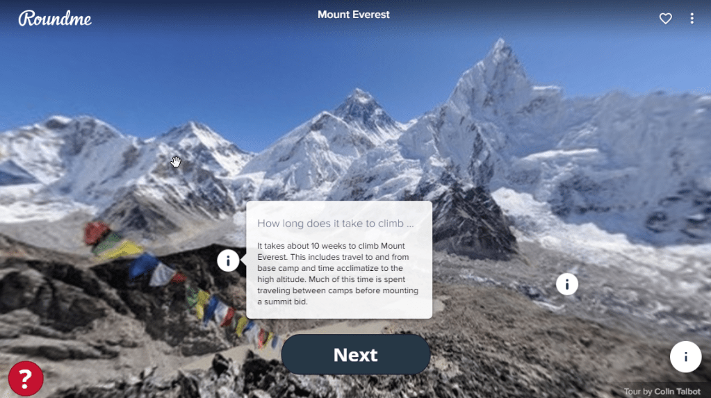 In this experiment I used RoundMe to embed 360 degree images to build an announcement course for an upcoming program. The learners had to find the information about the program while learning fun facts about Mt. Everest.